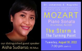 Mrs. Aisha Sudiarso-Pletscher will appear as guest speaker in Dr. Johannes Sebastian Nugroho's "24th Analytical Interpretation: Insights and Inspirations" talking about Mozart's Piano Sonata in a minor, KV.310. The event will take place on Tuesday, August 30th 2022 at 19.00 wib (GMT +7) via zoom. This event can [...]