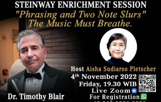 Steinway Enrichment Session presents Steinway Artist Dr. Timothy Blair, discussing "Phrasing and Two-Note Slurs". Hosted by Ibu Aisha Sudiarso-Pletscher, this event is scheduled to air on Friday, November 4th 2022 at 19.30 wib (GTM +7) via zoom. Registration can be made through Whatsapp +62 878 0021 8800 [...]