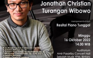 Alumnus Jonathan C. T. Wibowo is scheduled to perform a solo recital at Amir Pasaribu Concert Hall @ Rudy Laban Music Center, Sekolah Musik YPM Bintaro on Sunday, October 16th 2022 at 14.00 wib (GMT +7). Program as follows: Wolfgang Amadeus Mozart: Fugue in G minor, K.V. 154/385k [...]