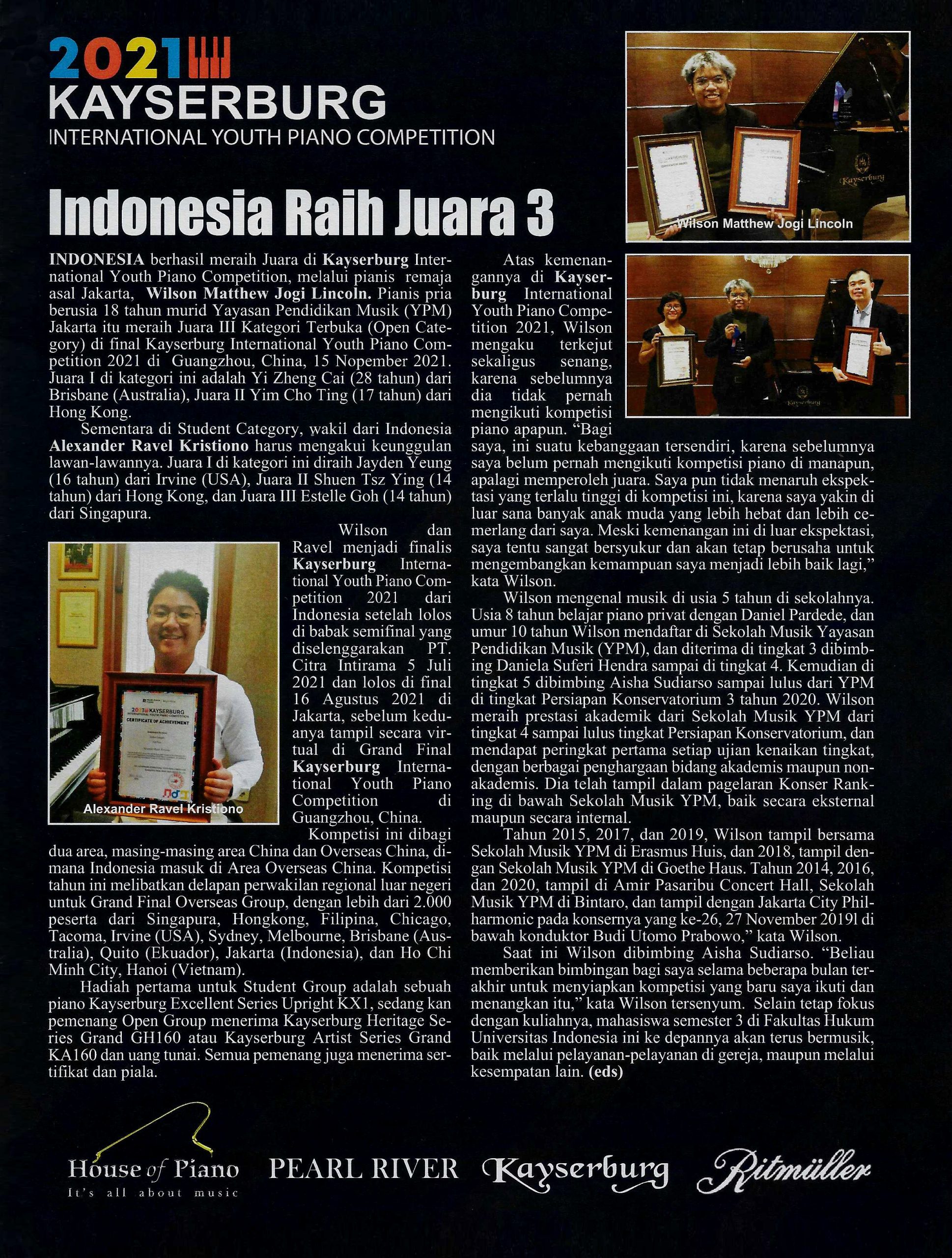 Wilson Matthew Jogi Lincoln, alumnus of the YPM Music School Class of 2021, has been awarded 3rd place at the Keyserburg International Youth Piano Competition 2021 held in November 2021.